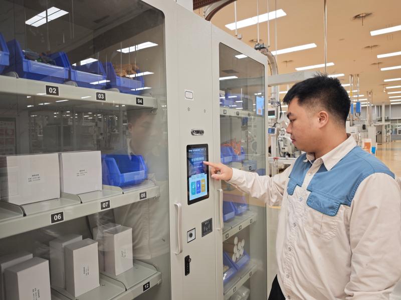 每个仓位均配备了重力传感器和RFID识别模块,实现了物料领用环节的全程数字化与可视化。“这是一个按我们车间需求定制的‘智能管家’。”设备副领班谢俊晖介绍,员工通过刷脸或工卡认证后,系统会根据预设的岗位权限显示可领用的物品清单,既便捷高效,又规范了领用流程,有效避免了错领、多领。系统设置的领用上限功能,也为成本精细化管理提供了技术支撑。
