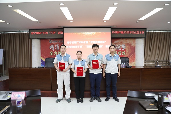 最后,共青团南宁市委书记文瑞,南宁卷烟厂党委副书记、副厂长、工会主席唐永佳分别为南宁卷烟厂2020年度“优秀共青团员”“优秀共青团干部”“五四红旗团支部”颁奖。