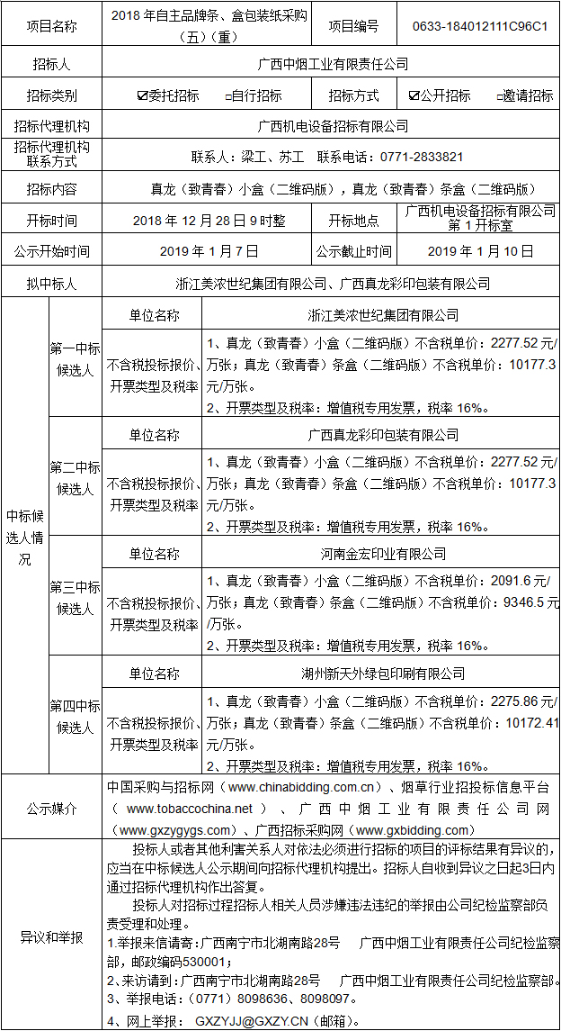 中标候选人公示(2018年自主品牌条、盒包装纸采购(五)(重)项目编号:0633-184012111C96C1)