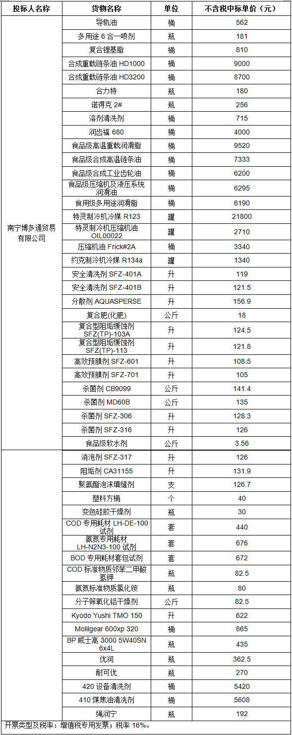 标段一:导轨油、多用途6合一喷剂等不含税中标单价
