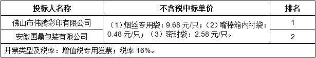 标段三:烟丝专用袋、嘴棒箱内衬袋、密封袋不含税中标单价