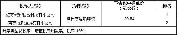 标段五中标人:江苏光辉粘合科技有限公司、南宁博多通贸易有限公司