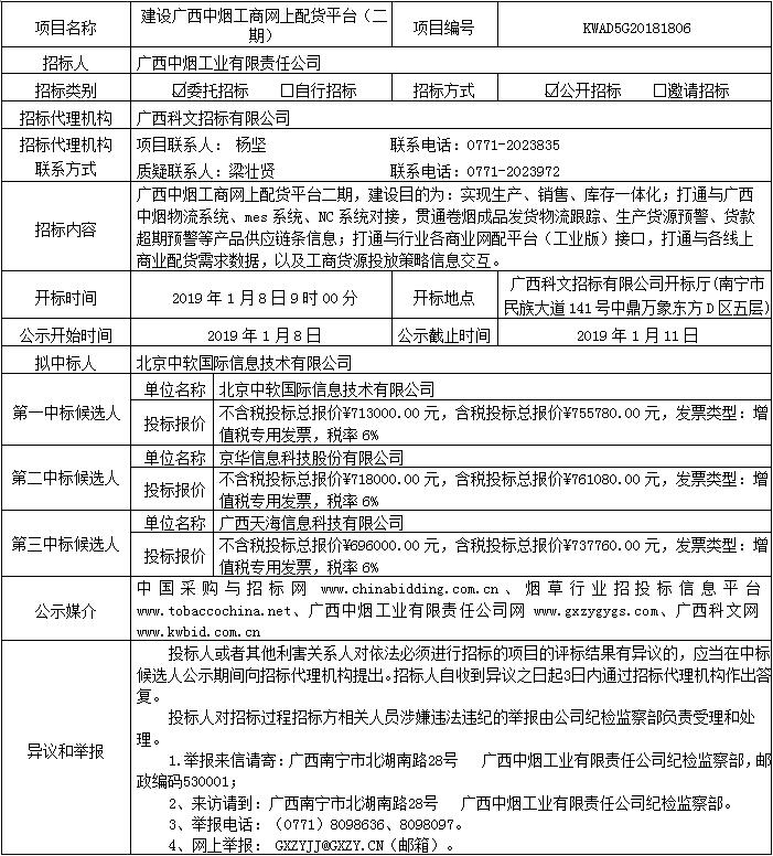 中标候选人公示(建设广西中烟工商网上配货平台(二期)(KWAD5G20181806))