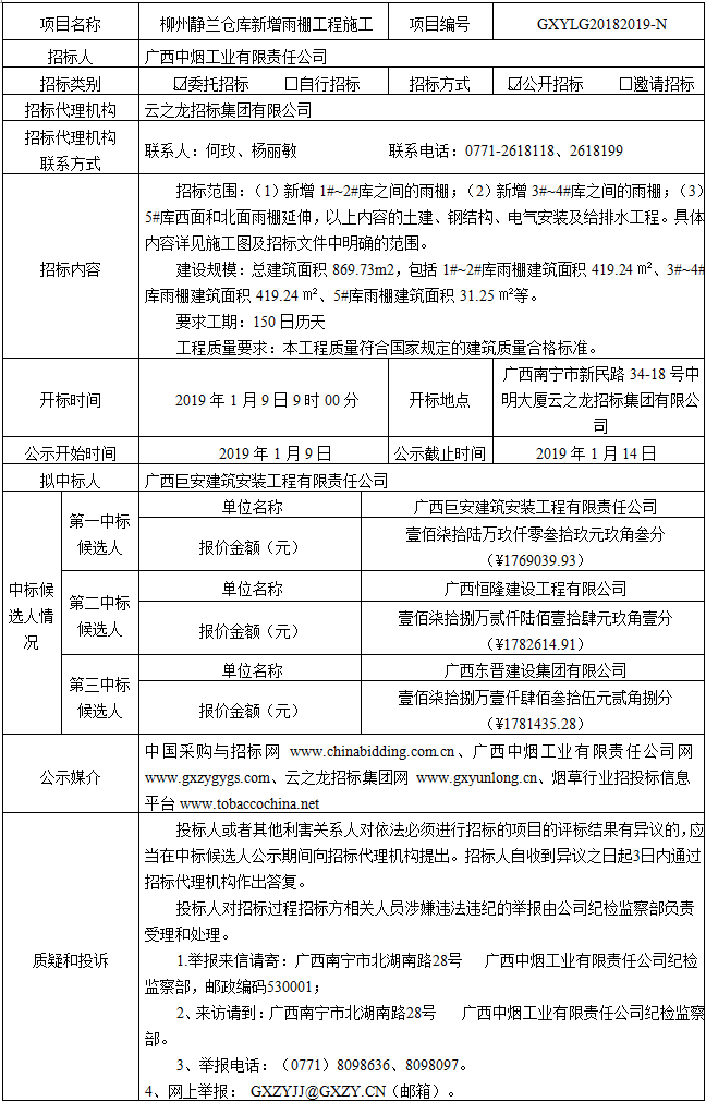 中标候选人公示(柳州静兰仓库新增雨棚工程施工)