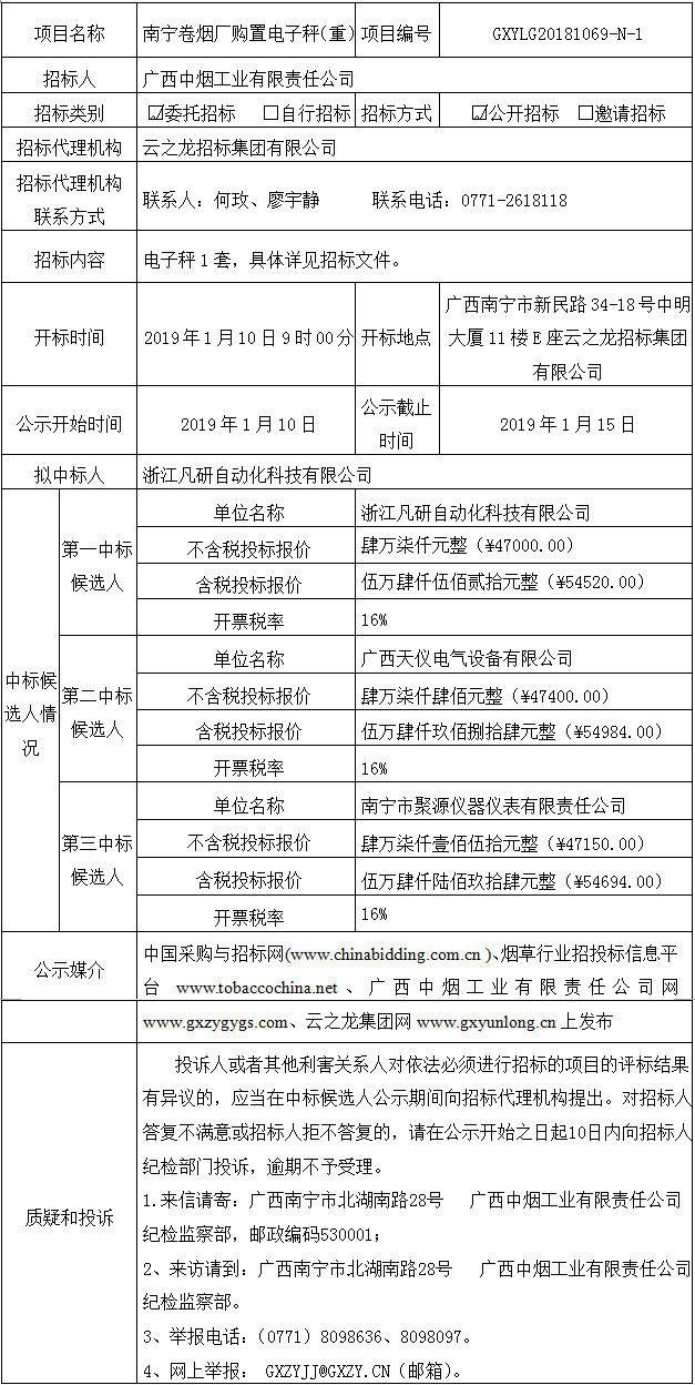 中标候选人公示(南宁卷烟厂购置电子秤(重)GXYLG20181069-N-1)