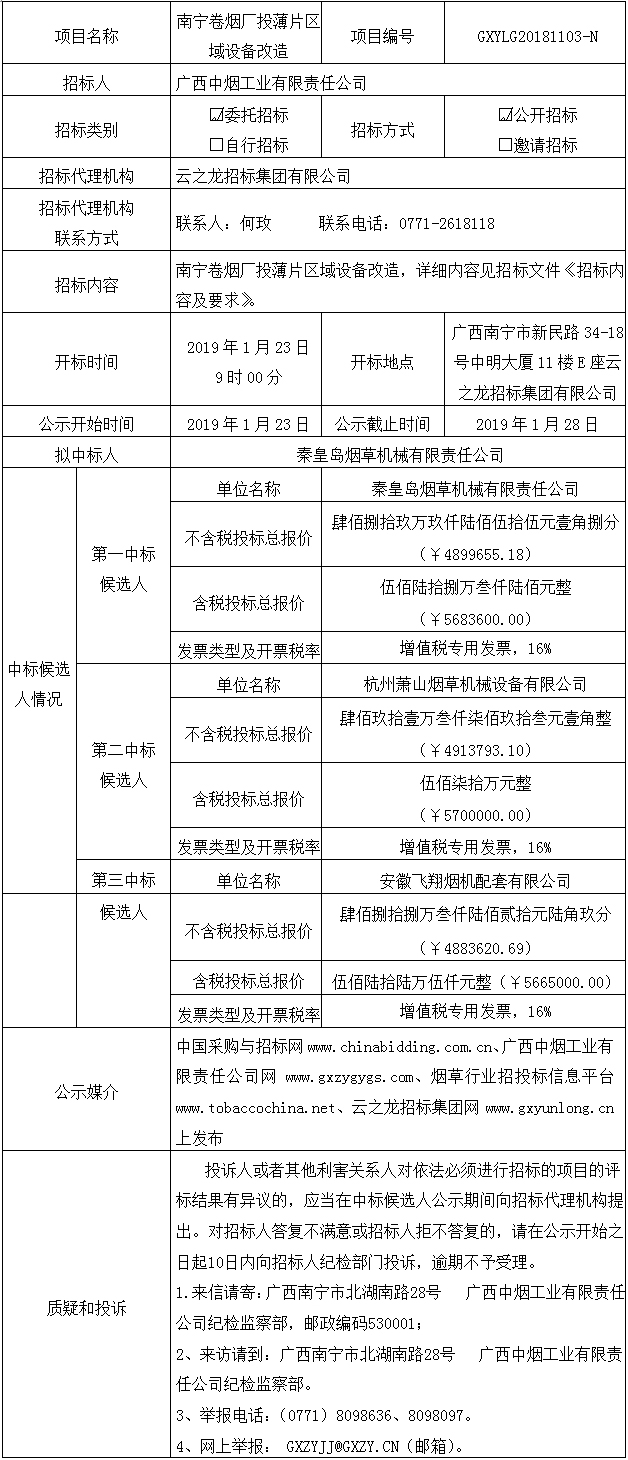 中标候选人公示(南宁卷烟厂投薄片区域设备改造GXYLG20181103-N)