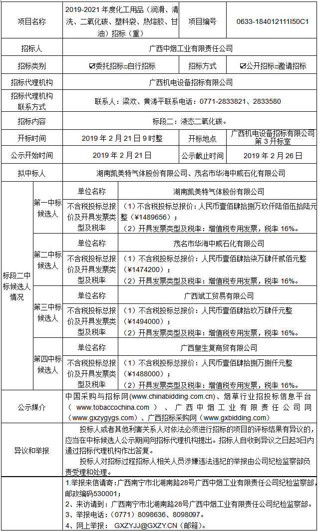 中标候选人公示(2019-2021年度化工用品(润滑、清洗、二氧化碳、塑料袋、热熔胶、甘油)招标(重)-标段二(项目编号:0633-184012111I50C1))