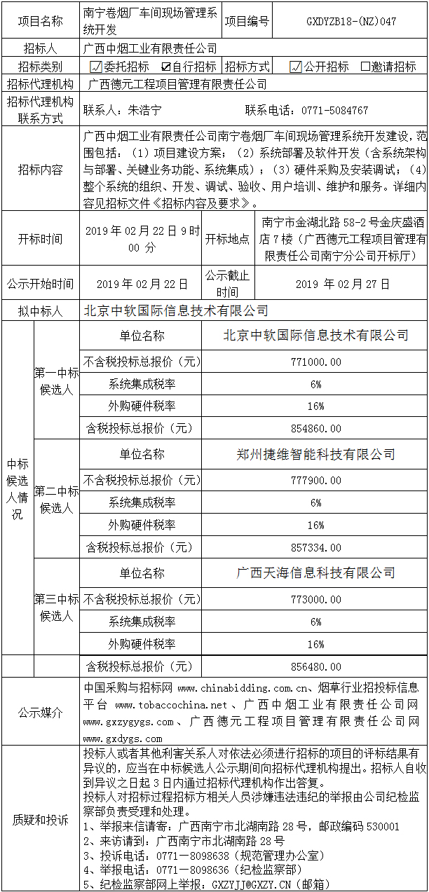 中标候选人公示(南宁卷烟厂车间现场管理系统开发)