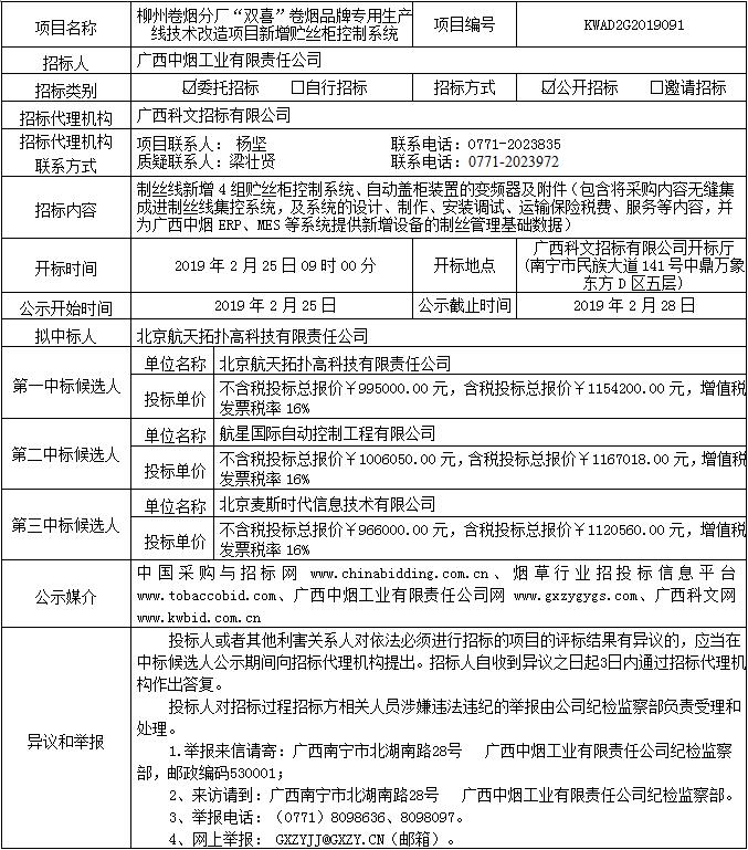 中标候选人公示(柳州卷烟分厂“双喜”卷烟品牌专用生产线技术改造项目新增贮丝柜控制系统(KWAD2G2019091))
