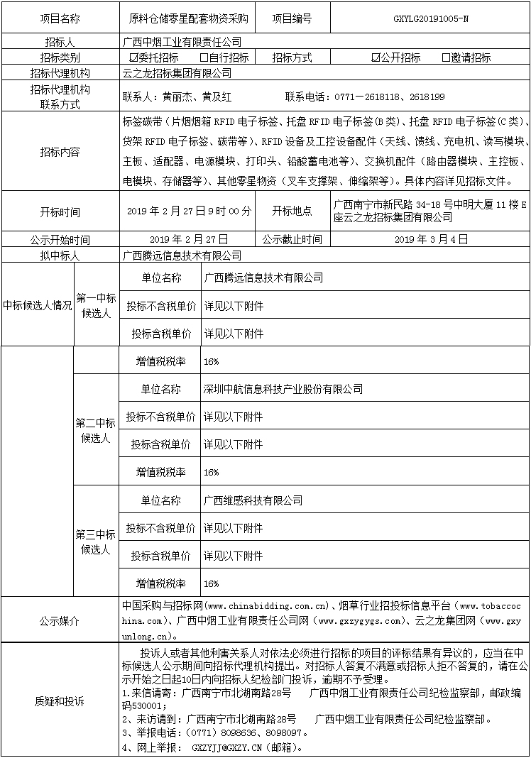 中标候选人公示(原料仓储零星配套物资采购GXYLG20191005-N)
