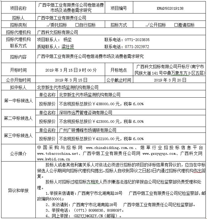 中标候选人公示(广西中烟工业有限责任公司卷烟消费市场及消费者需求研究KWAD5G2019138)