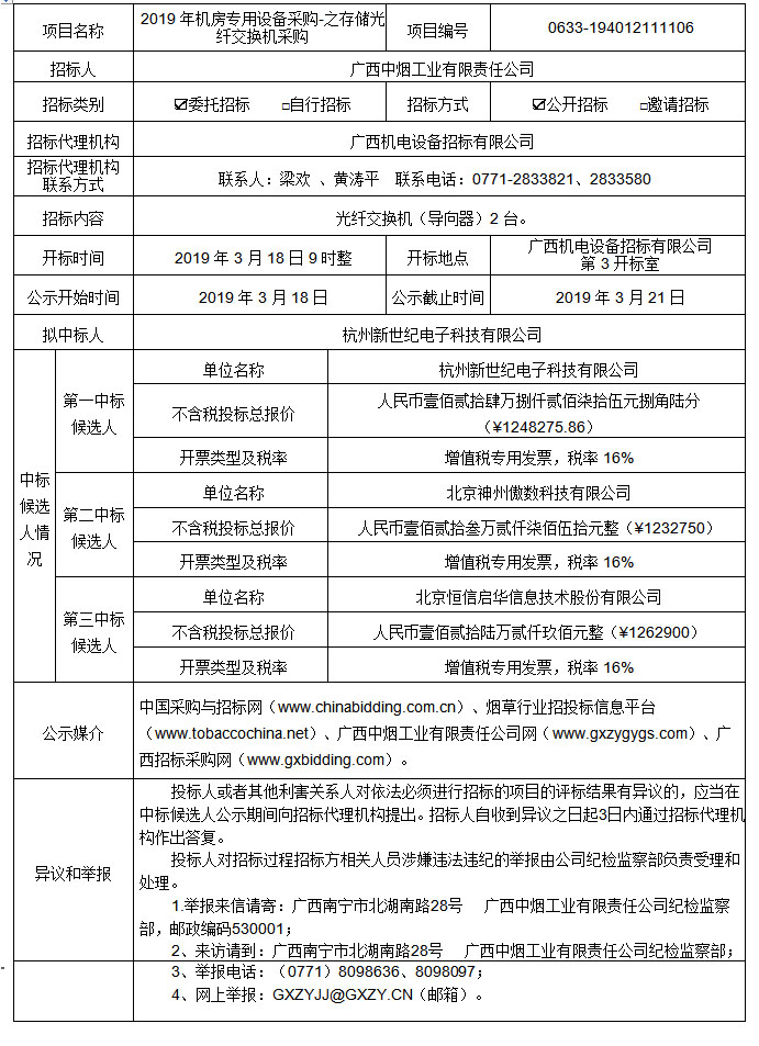中标候选人公示(2019年机房专用设备采购-之存储光纤交换机采购(项目编号:0633-194012111106))