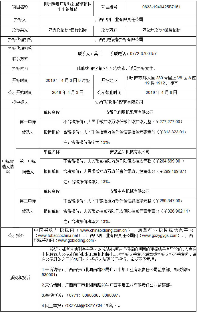 中标候选人公示(柳州卷烟厂膨胀线储柜铺料车车轮维修 项目编号:0633-1940425B7151)