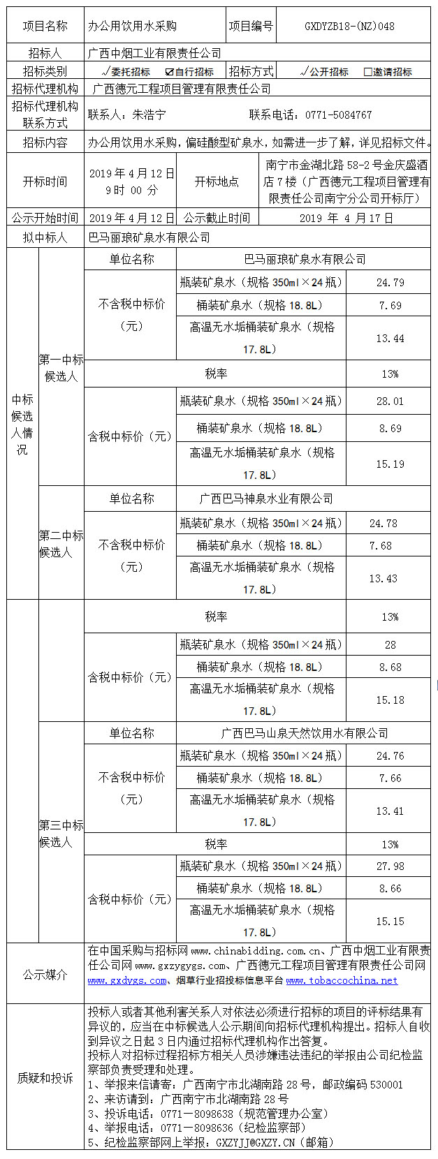 中标候选人公示(办公用饮用水采购)