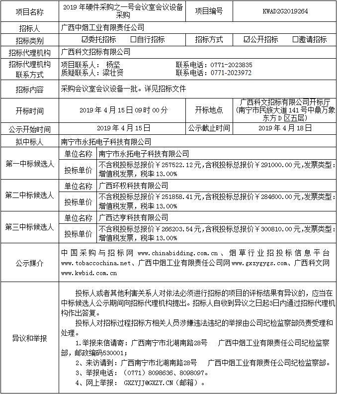 中标候选人公示(2019年硬件采购之一号会议室会议设备采购(KWAD2G2019264))