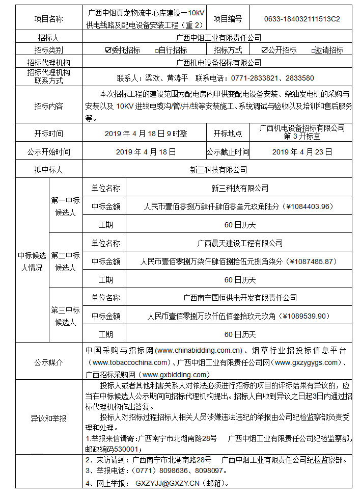 广西中烟真龙物流中心库建设—10kV供电线路及配电设备安装工程(重2)(项目编号:0633-184032111513C2)中标候选人公示