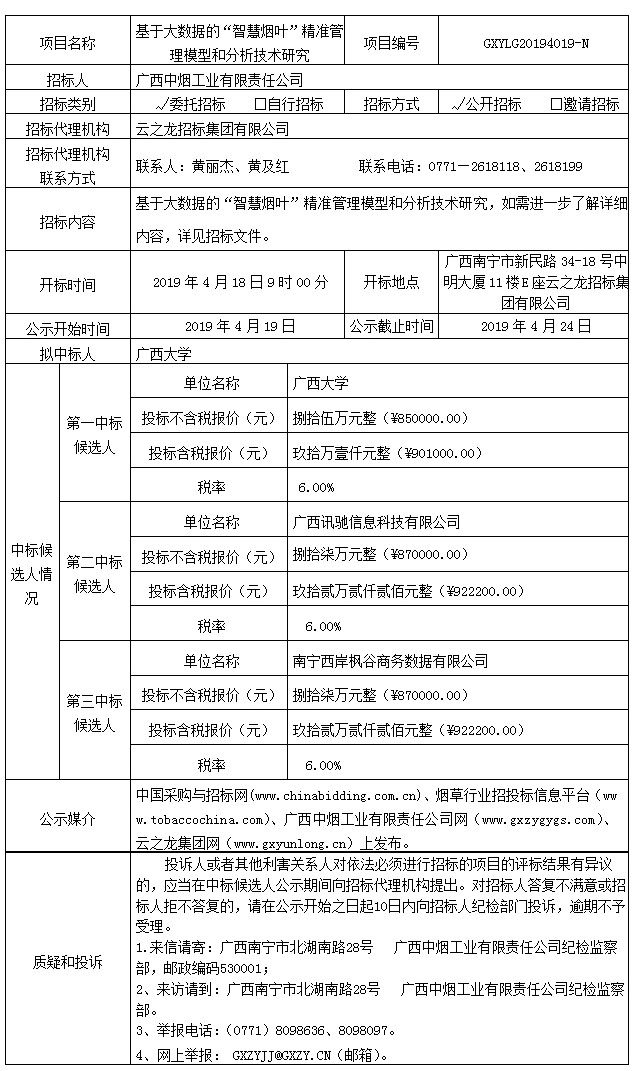 中标候选人公示(基于大数据的“智慧烟叶”精准管理模型和分析技术研究GXYLG20194019-N)