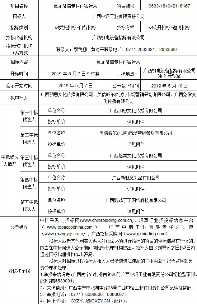 中标候选人公示(真龙微信专栏内容运营(项目编号:0633-184042118K67))