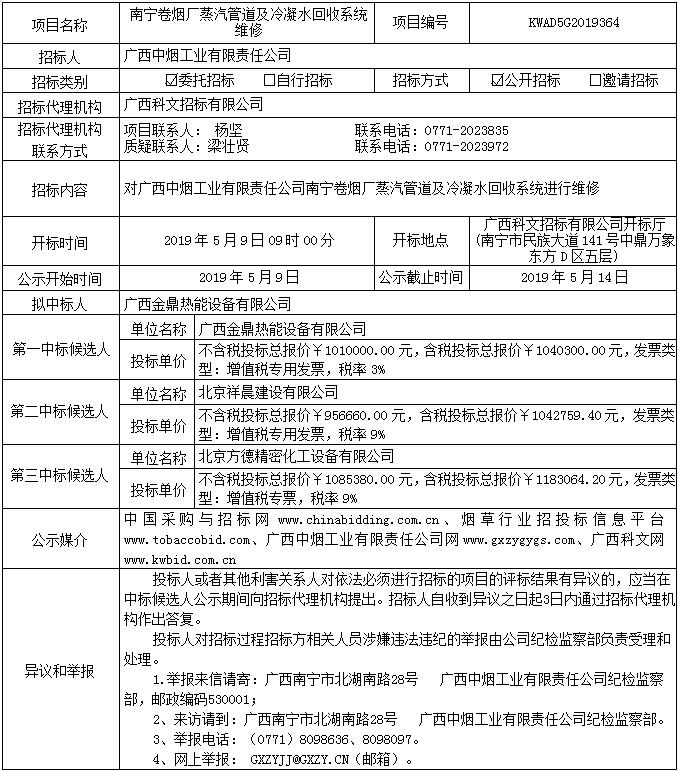 中标候选人公示(南宁卷烟厂蒸汽管道及冷凝水回收系统维修(KWAD5G2019364))