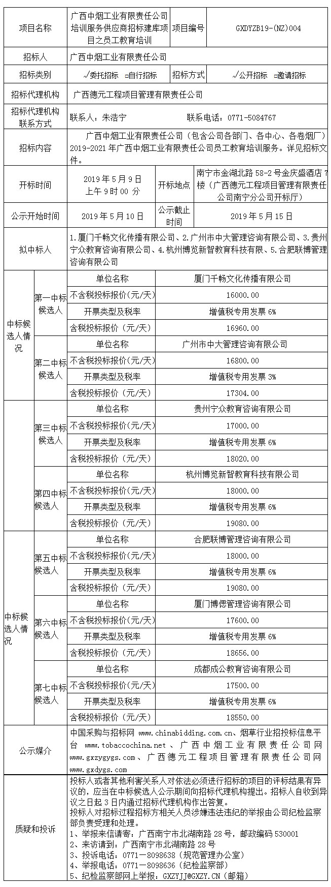中标候选人公示(广西中烟工业有限责任公司培训服务供应商招标建库项目之员工教育培训)