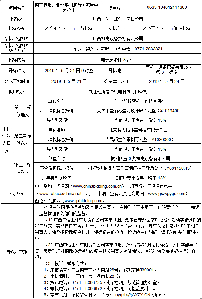 中标候选人公示(南宁卷烟厂制丝车间购置恒流量电子皮带秤)