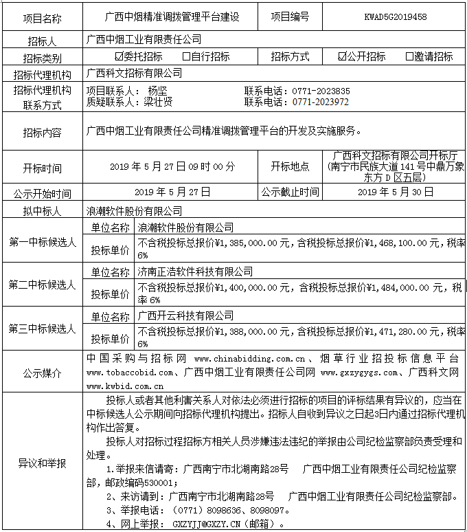 中标候选人公示(广西中烟精准调拨管理平台建KWAD5G2019458))