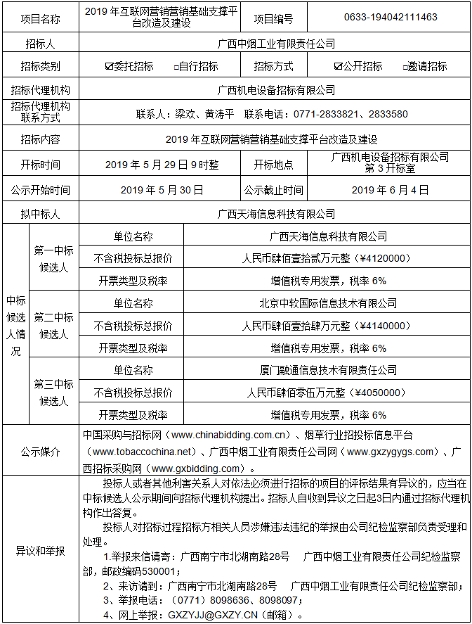 中标候选人公示(2019年互联网营销营销基础支撑平台改造及建设 项目编号:0633-194042111463)