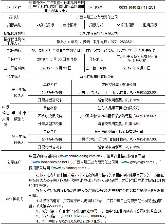 中标候选人公示(柳州卷烟分厂“双喜”卷烟品牌专用生产线技术改造项目新增叶丝回潮机相关配套(重)(项目编号:0633-194012111112C1))