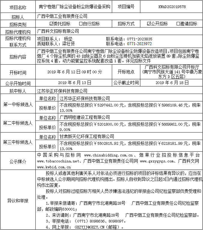 中标候选人公示(南宁卷烟厂除尘设备粉尘防爆设备采购(KWAD2G2019578))