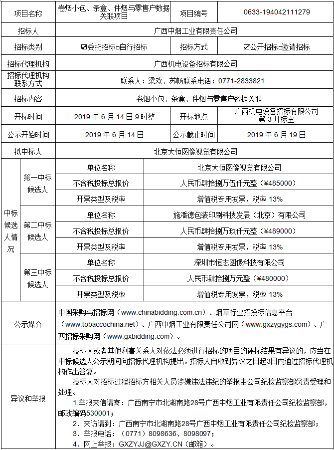 卷烟小包、条盒、件烟与零售户数据关联项目(项目编号:0633-194042111279)中标候选人公示