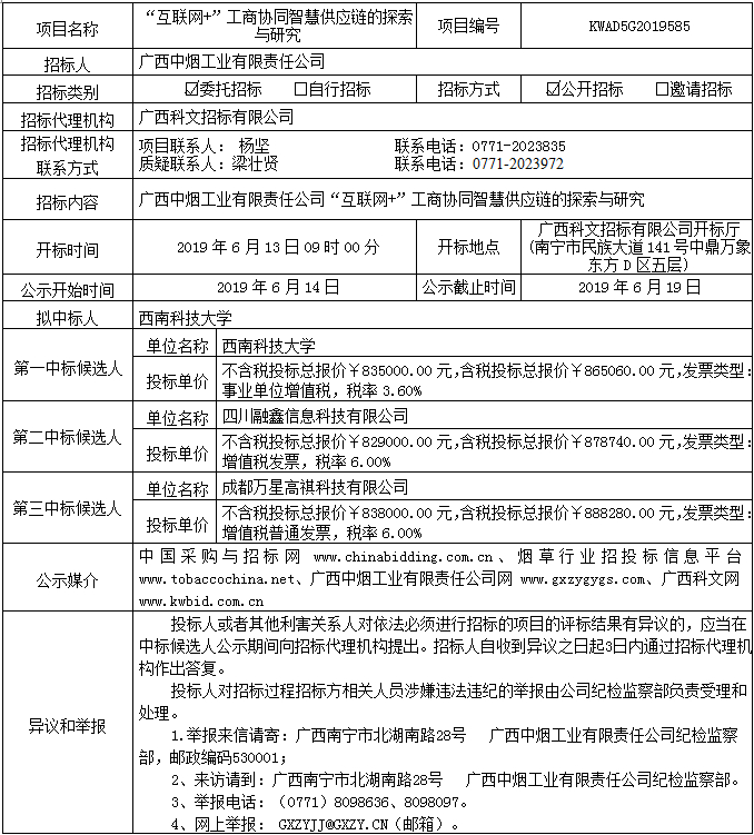 中标候选人公示(“互联网+”工商协同智慧供应链的探索与研究(KWAD5G2019585))