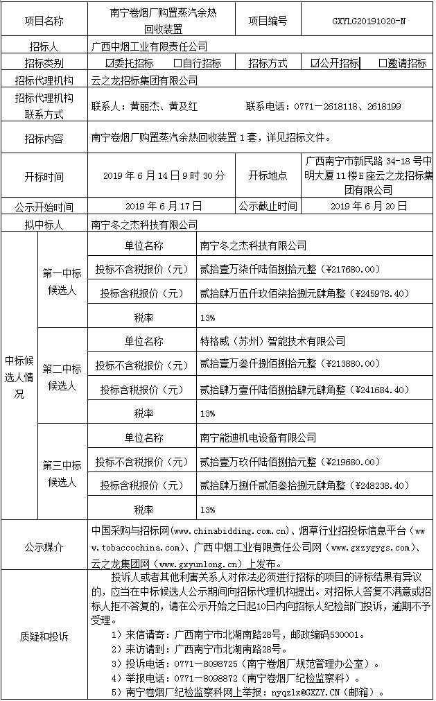 中标候选人公示(南宁卷烟厂购置蒸汽余热回收装置GXYLG20191020-N)