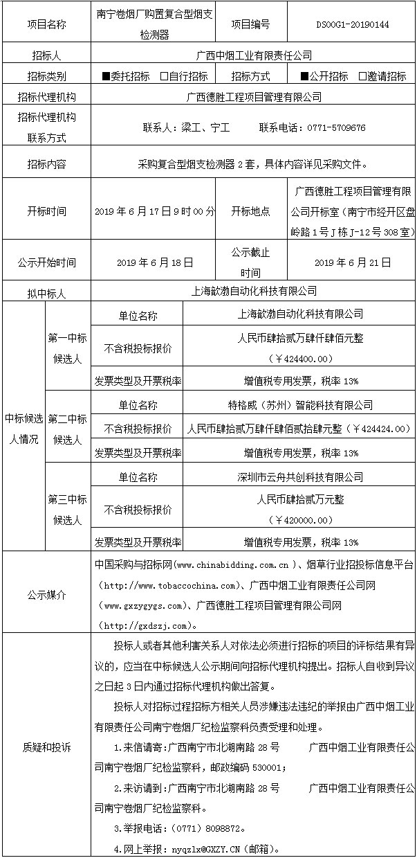 南宁卷烟厂购置复合型烟支检测器中标候选人公示