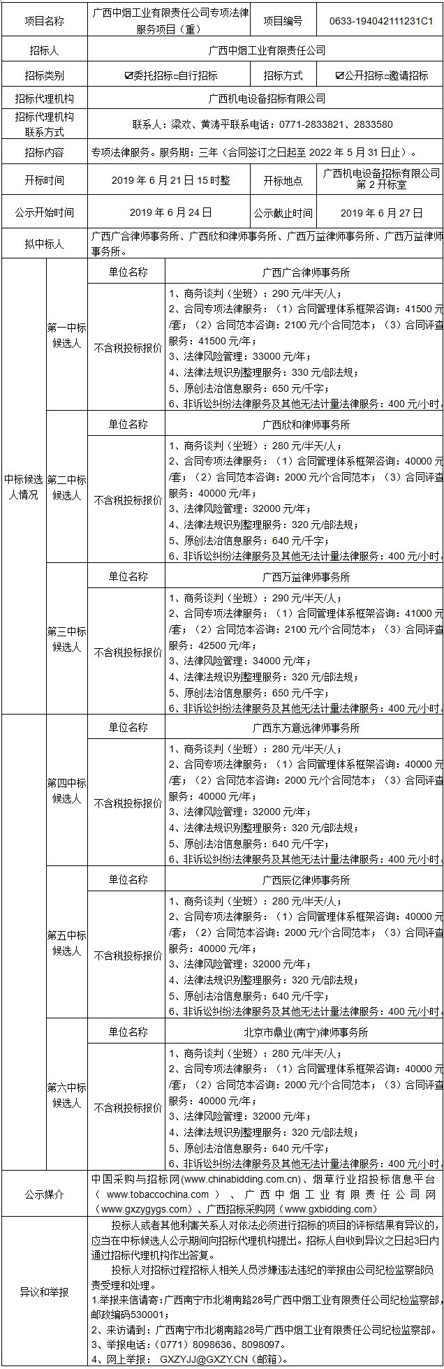 广西中烟工业有限责任公司专项法律服务项目(重)(项目编号:0633-194042111231C1)中标候选人公示