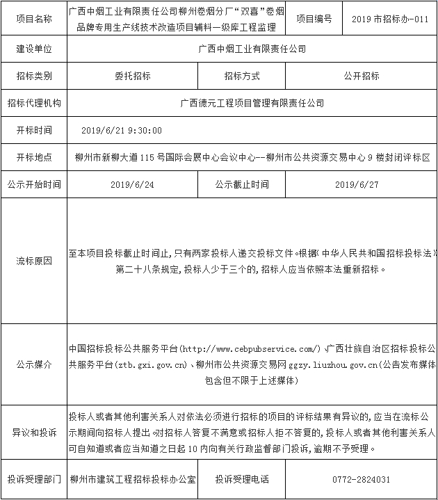 流标公示(柳州卷烟分厂“双喜”卷烟品牌专用生产线技术改造项目辅料一级库工程监理)