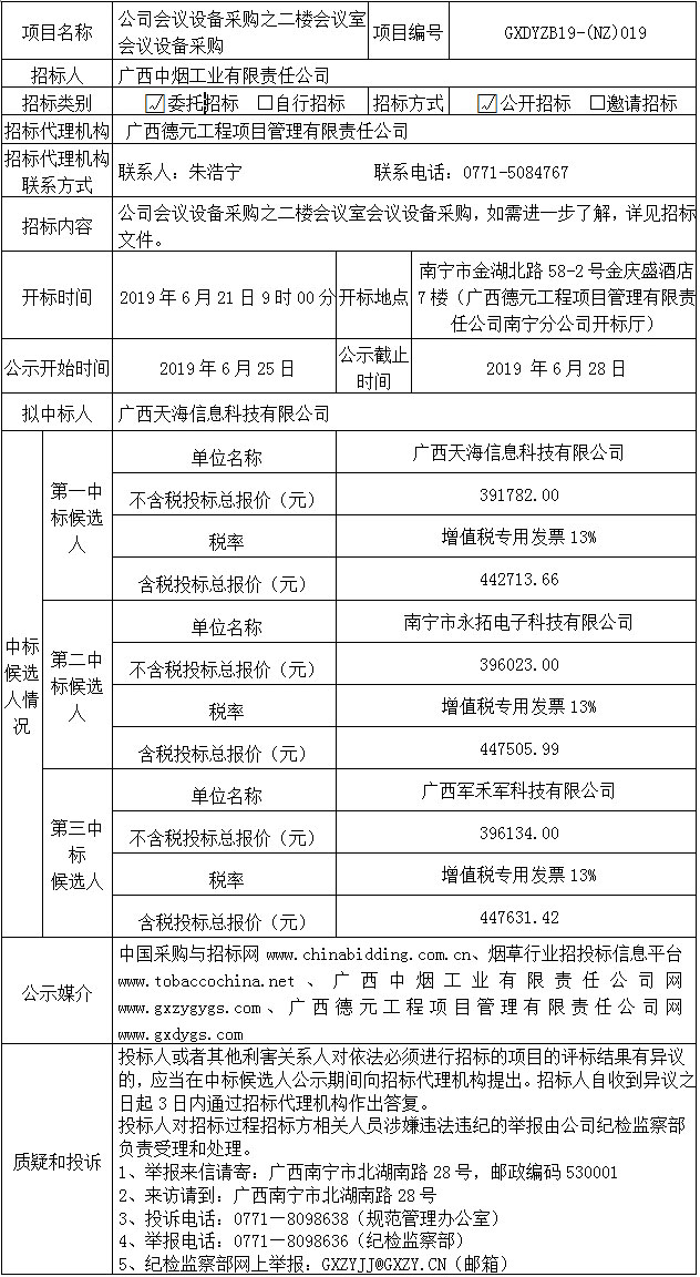 公司会议设备采购之二楼会议室会议设备采购中标候选人公示