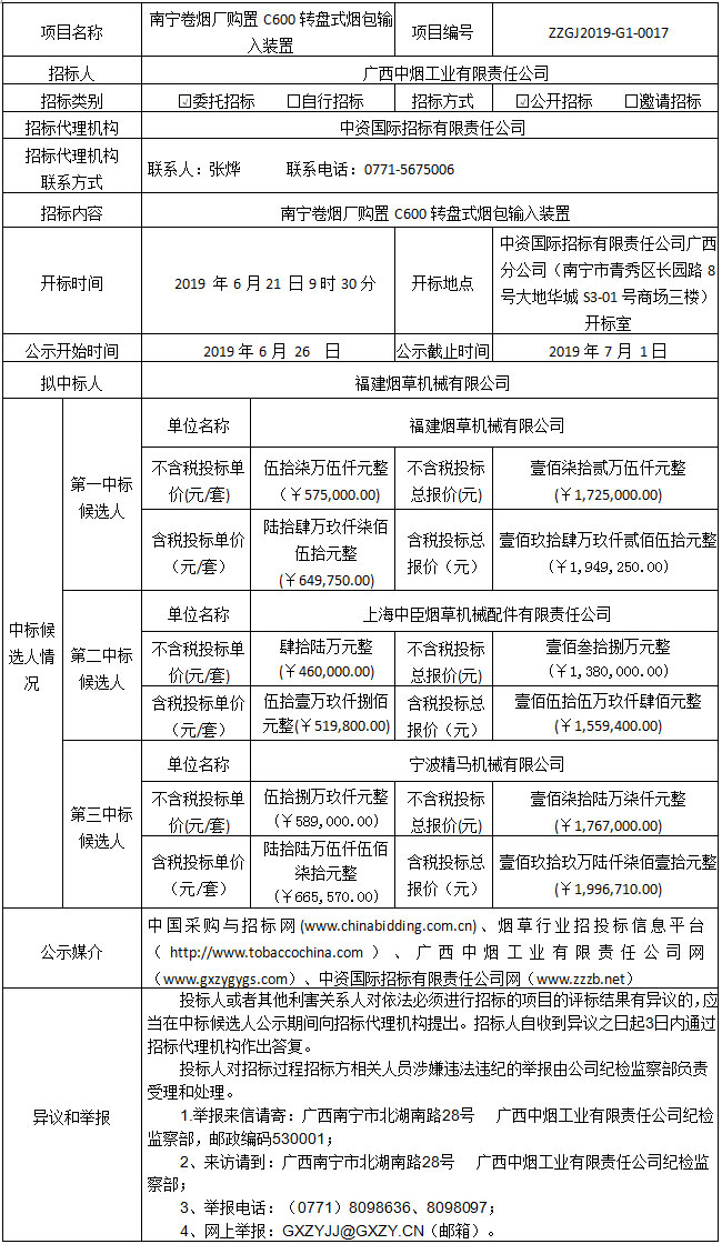 中标候选人公示(南宁卷烟厂购置C600转盘式烟包输入装置)