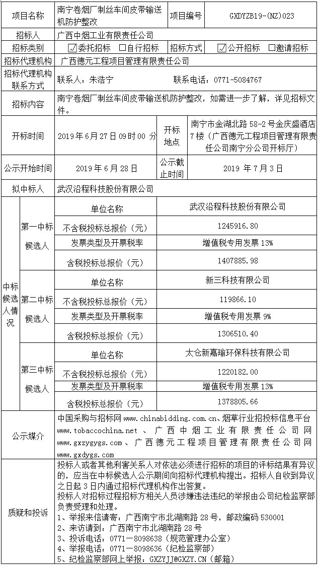 南宁卷烟厂制丝车间皮带输送机防护整改中标候选人公示