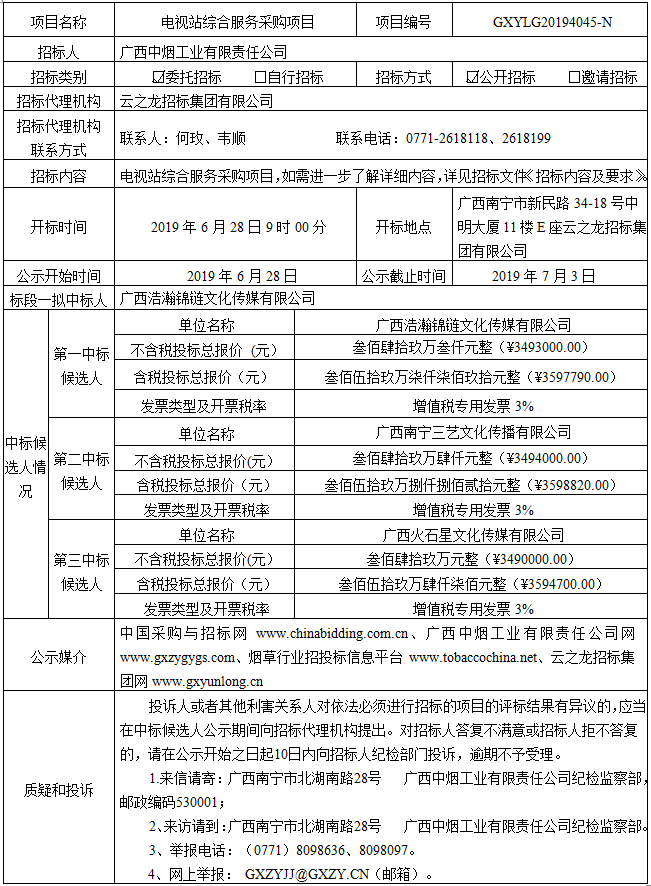 中标候选人公示(电视站综合服务采购项目GXYLG20194045-N)