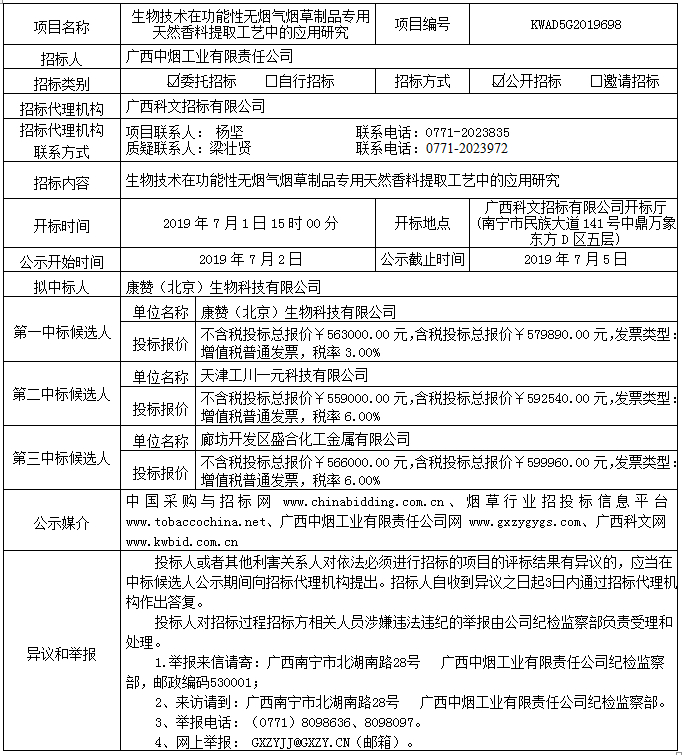 生物技术在功能性无烟气烟草制品专用天然香料提取工艺中的应用研究(KWAD5G2019698)中标候选人公示