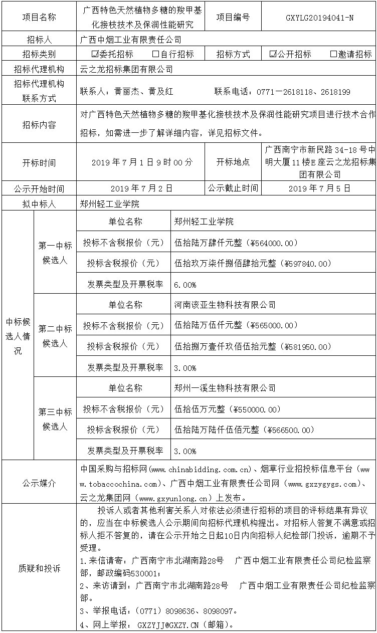 中标候选人公示(广西特色天然植物多糖的羧甲基化接枝技术及保润性能研究GXYLG20194041-N)