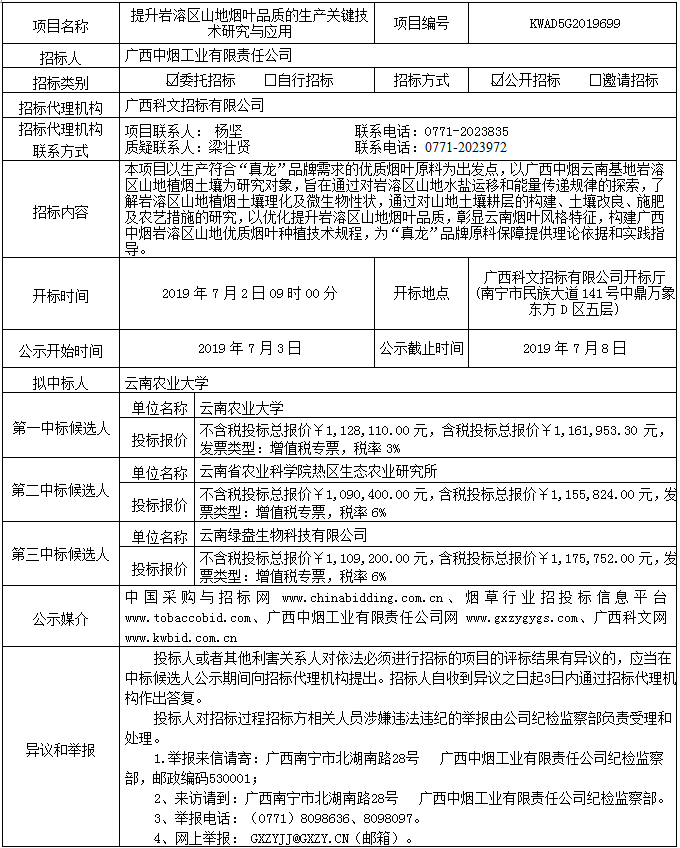 中标候选人公示(提升岩溶区山地烟叶品质的生产关键技术研究与应用(KWAD5G2019699))
