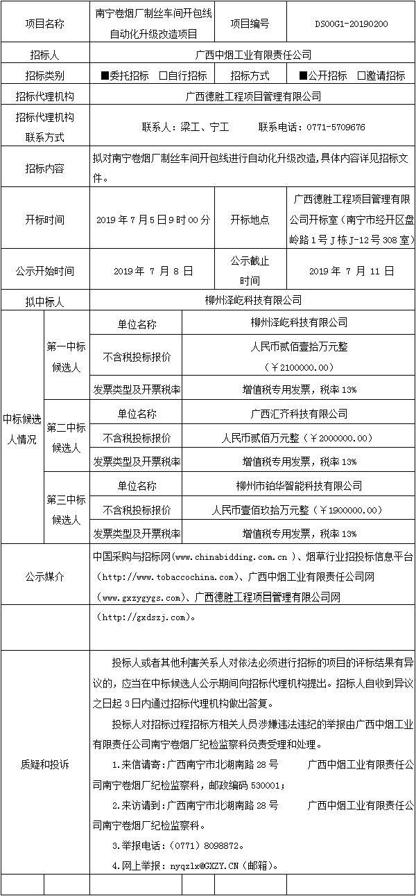 中标候选人公示(南宁卷烟厂制丝车间开包线自动化升级改造项目)