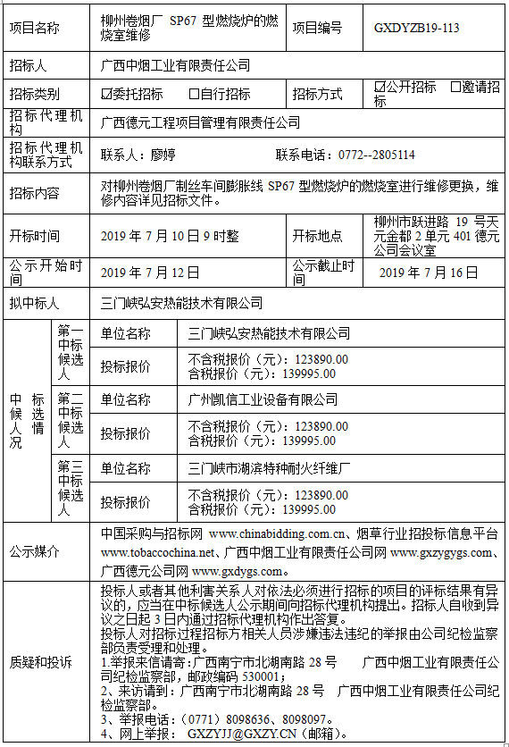 中标候选人公示(柳州卷烟厂SP67型燃烧炉的燃烧室维修)