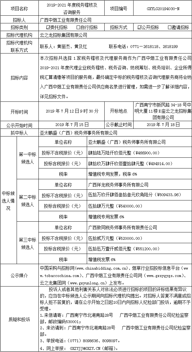 中标候选人公示(2019-2021年度税务稽核及咨询服务GXYLG20194030-N)