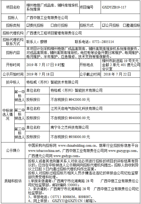 中标候选人公示(柳州卷烟厂成品库、辅料库堆垛机系统维保)
