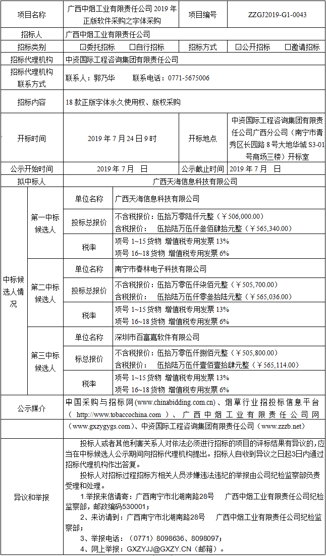 中标候选人公示(广西中烟工业有限责任公司2019年正版软件采购之字体采购)