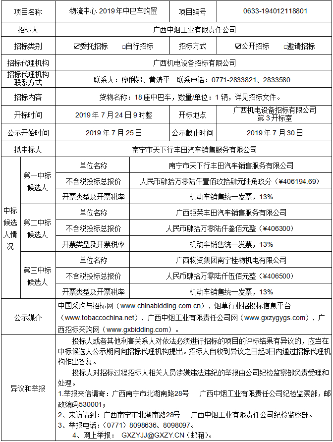 中标候选人公示(物流中心2019年中巴车购置(项目编号:0633-194012118801))