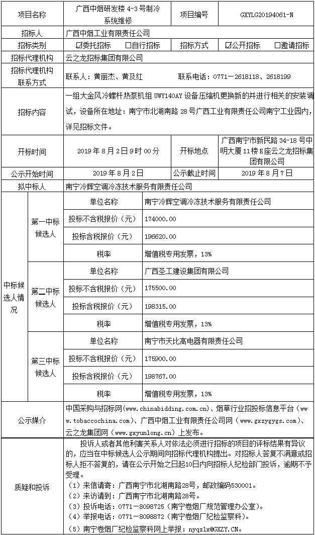 中标候选人公示(广西中烟研发楼4-3号制冷系统维修GXYLG20194061-N)