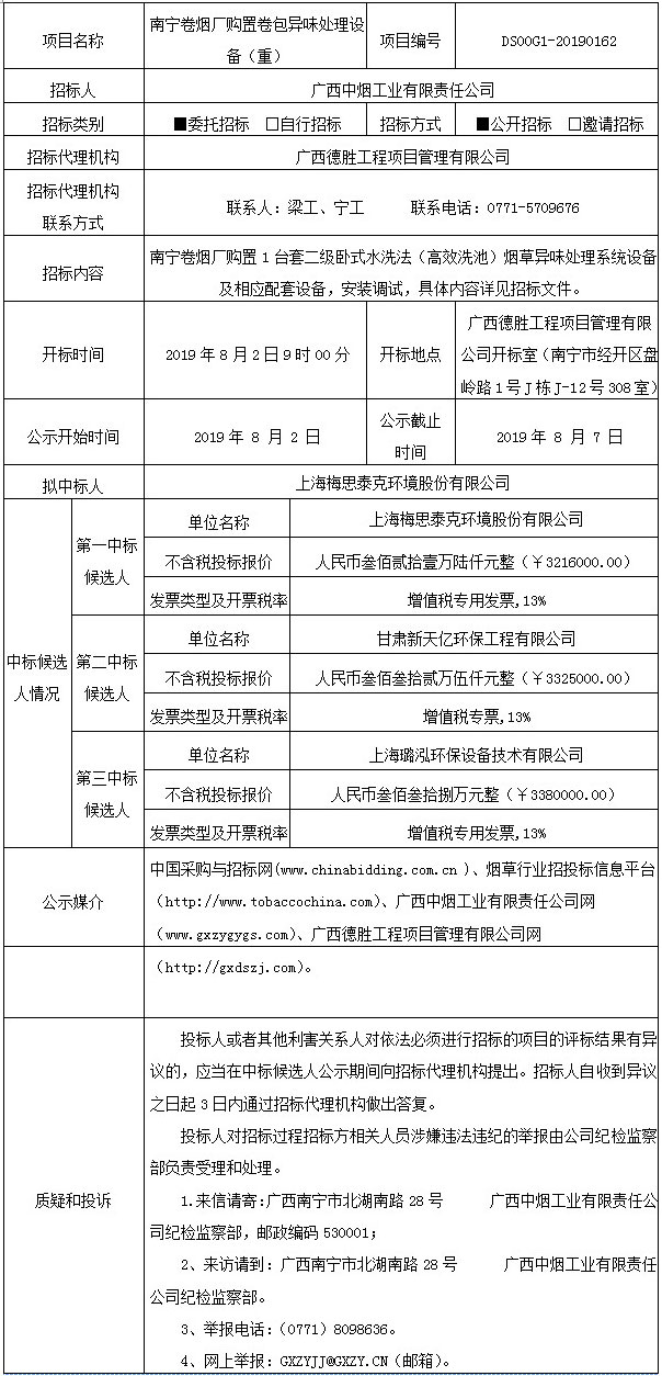 中标候选人公示(南宁卷烟厂购置卷包异味处理设备(重))